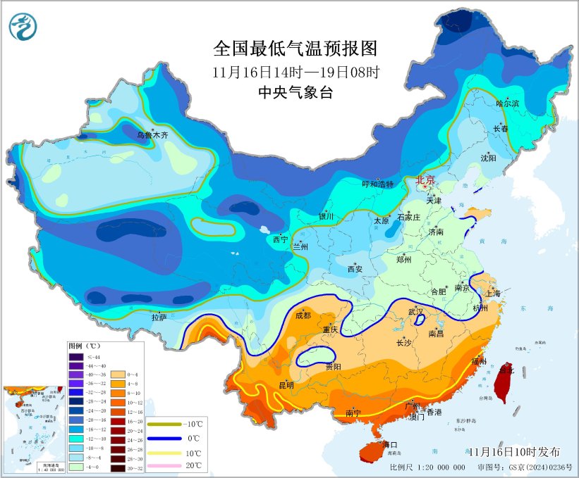 中央气象台11月16日10时继续发布寒潮蓝色预警:受寒潮影响,预计,11月16日至18日,我国中东部地区将自北向南出现大风降温天气,日平均或最低气温普遍下降6~10℃,陕西南部、重庆北部、河南西部和南部、湖北西部和北部等地下降12~14℃,局地降温可超过16℃。18日前后,最低温度0℃线将南压到苏皖南部至湖北中部一带。